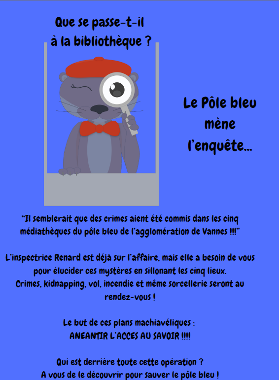 Crimes, kidnapping, vol, incendie et même sorcellerie… des événements mystérieux secouent les bibliothèques du Pôle Bleu ! L’inspectrice Renard est sur l’affaire, mais elle a besoin de vous !