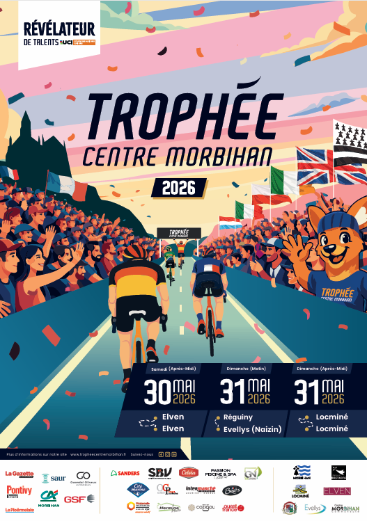 Le compte à rebours est lancé ! Les 30 et 31 mai 2026, le Trophée Centre Morbihan fera son grand retour pour sa 43ᵉ édition, en accueillant l’élite mondiale du cyclisme dans le cadre de la Coupe des Nations UCI Juniors. Cette compétition internationale réunira plus de 100 coureurs âgés de 17 et 18 ans sur les routes morbihannaises. Les représentants de 15 équipes nationales venues d’Europe, d’Asie et d’Afrique, ainsi que 5 équipes françaises de formation, seront au départ. Le Dimanche 31 mai, la troisième et dernière étape se déroulera autour de Locminé avec une course en ligne de 116,8 km. À cette occasion, le peloton traversera votre commune, offrant aux habitants l’occasion d’encourager les jeunes cyclistes au bord de la route. Pour cette édition, le Trophée est honoré du parrainage de deux champions du cyclisme : Coralie Demay, originaire d’Elven et multiple championne de France, et Jordan Jegat, 10ᵉ du Tour de France 2025.