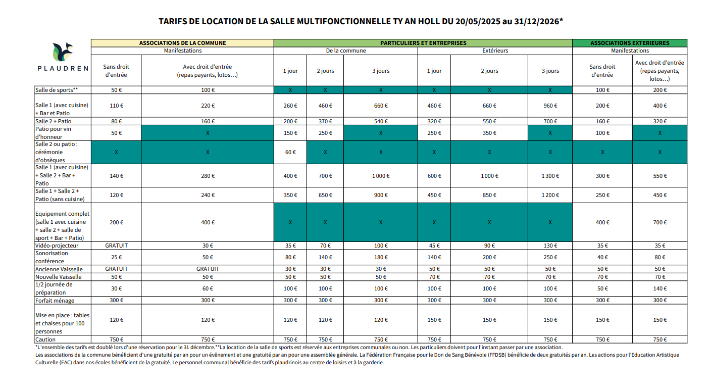 Il est appliqué aux tarifs des locations par les associations, un critère supplémentaire : manifestations avec droit d'entrée ou sans droit d'entrée. Il est considéré qu'une manifestation avec droit d'entrée est une manifestation à l'occasion de laquelle l'organisation demande au public une participation financière de type billet d'entrée, buvette, prix du repas, droit de jeu...